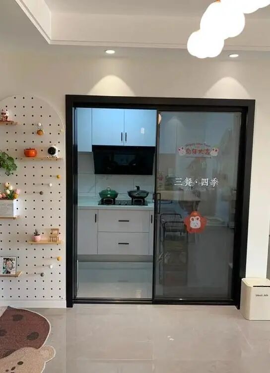 厨房安装了黑框玻璃门隔断,既通透又时尚简约,同时还能阻隔