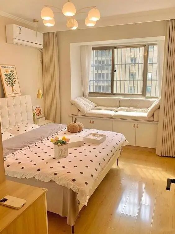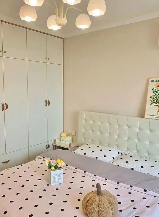 ,营造出自然温馨的氛围。床头背景墙刷了奶咖色的乳胶漆,温馨且具质感。床头还搭配了波点床品和棉花糖