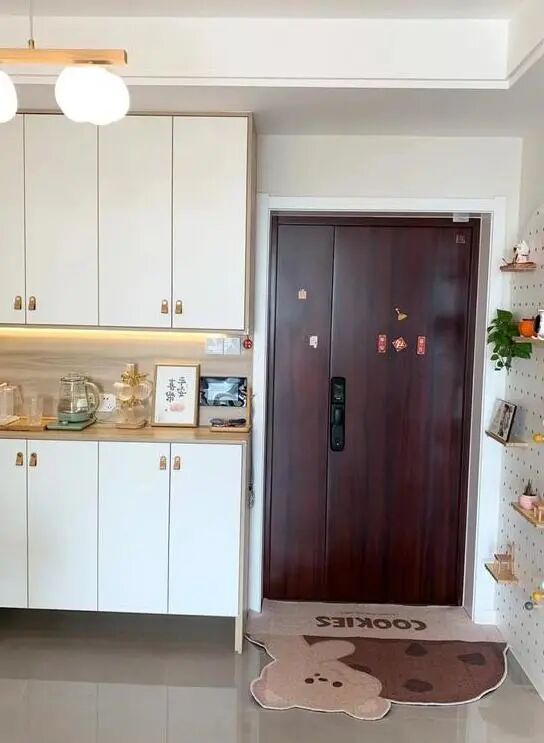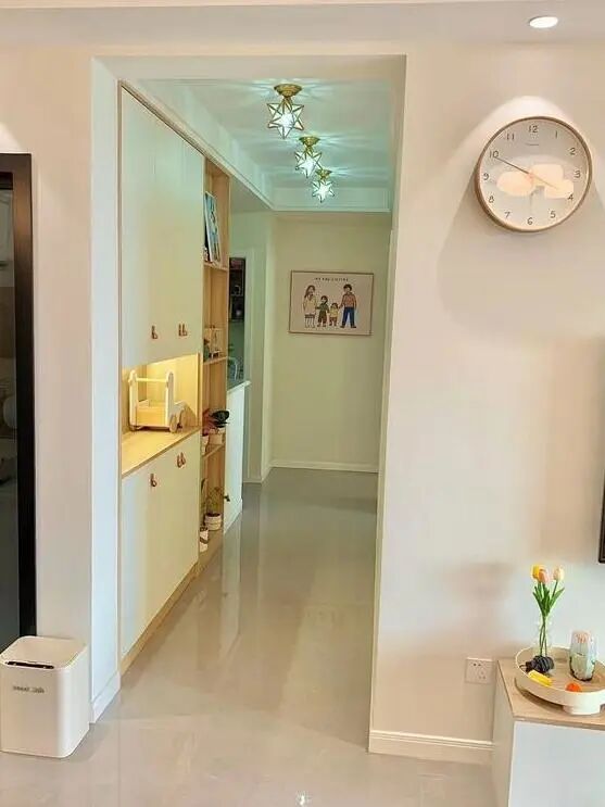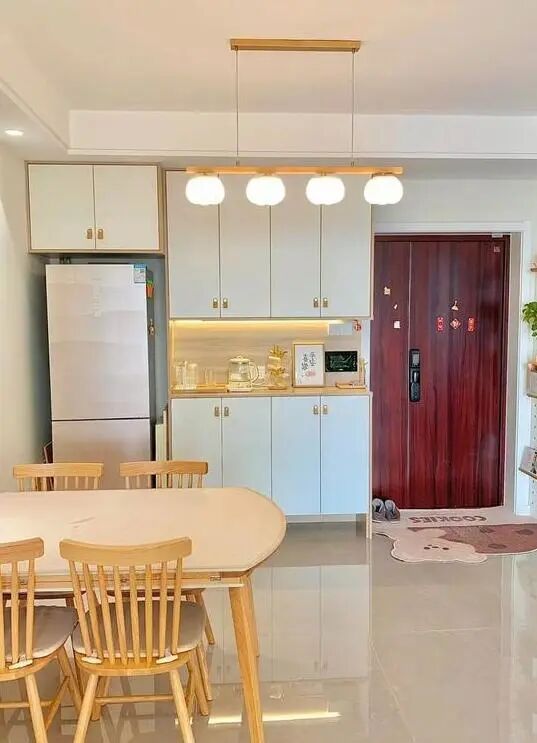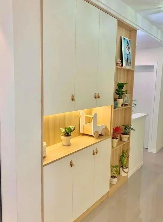 客厅入户门口左手边的拱形洞洞板不仅可以作为展示,还增加了收纳的功能,既美观又实用。而右手边的壁柜不仅满足了餐厅和客厅之间的过渡需求,还具备餐边柜和鞋柜的功能。柜子中间留出的空位方便了烧水壶、杯具等的摆放,底部的悬空设计则提供了常用鞋位的储存空间。尤其值得一提的是,柜子侧面还嵌入了一个冰箱,并与柜子持平,既不占地方又整洁有序。