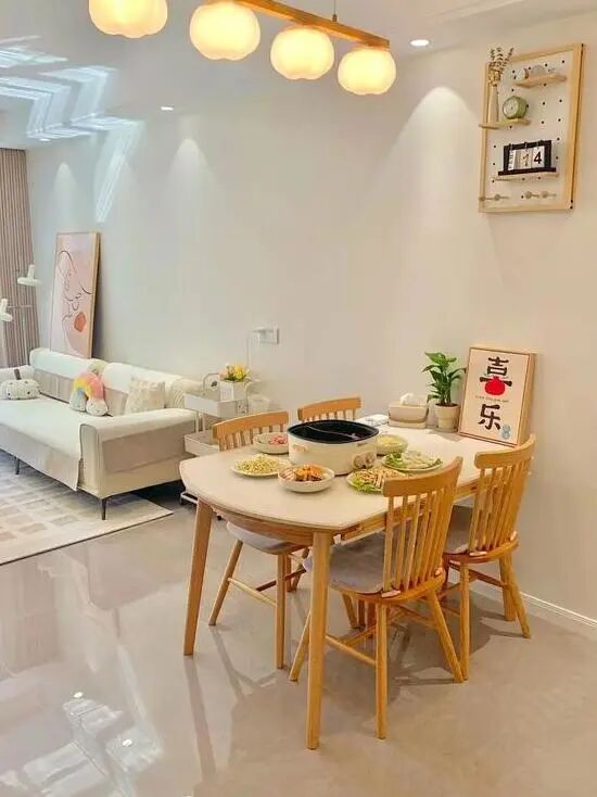 餐桌椅搭配一字棉花灯,营造出柔软温馨的就餐氛围。墙面上的洞洞板也起到了很好的装饰效果。