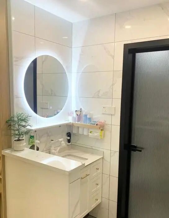 ,让空间显得干净明亮。洗手池下方有一个大柜子,可以存放日常的洗漱用品,非常方便。马桶采用了挂墙式的设计,增加了空间感。墙面上的镜子能够使空间显得更加宽敞。
