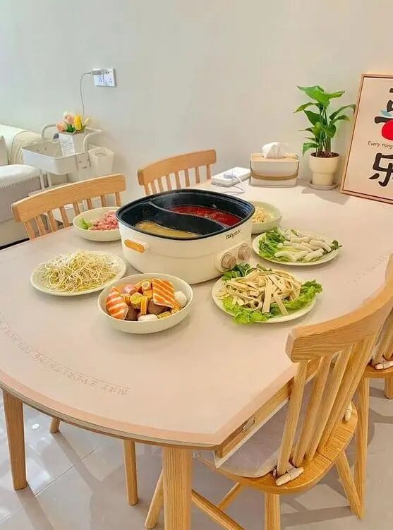 餐厅与客厅相连,采用弧形餐桌靠墙放置,这个餐桌还可以伸缩,方便应对不同时期人数的变化。