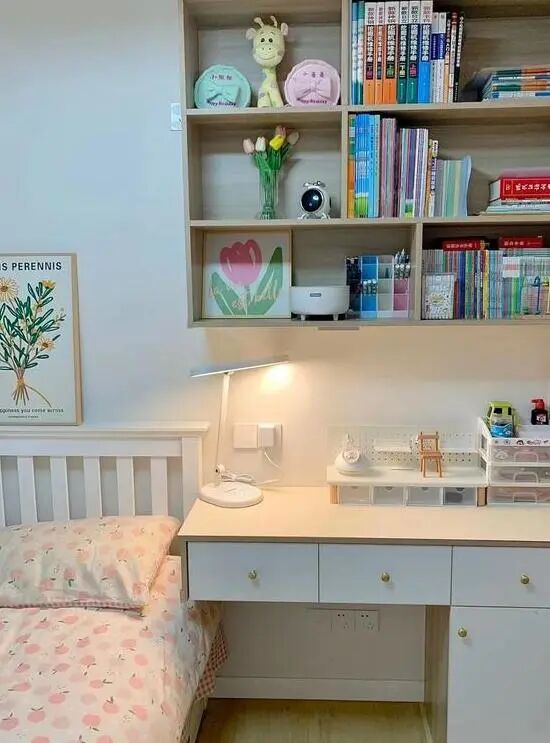 的设计与主卧一致,提供了充足的收纳空间。儿童房面积约7平米,全屋都使用了杏灰色的乳胶漆,格外简洁温馨。床头放置了一张1.5米宽的床,旁边的书桌柜方便孩子学习,墙上的开放柜可以用于书籍的存放,节省了空间,非常实用。
