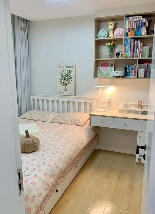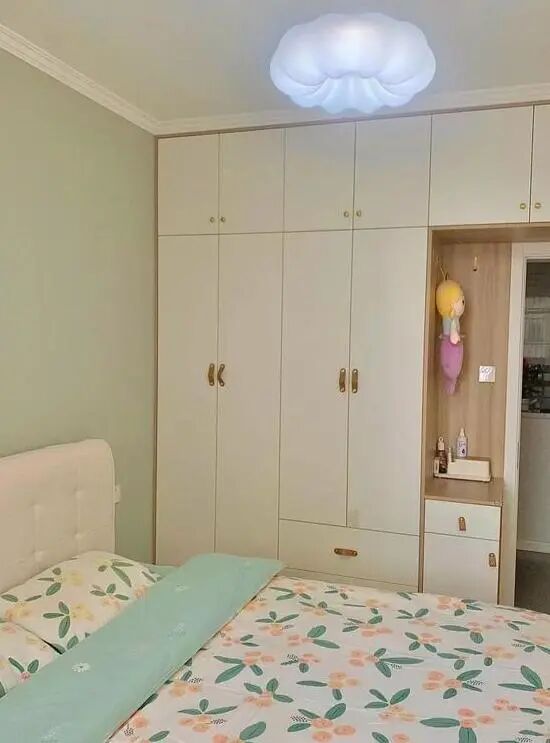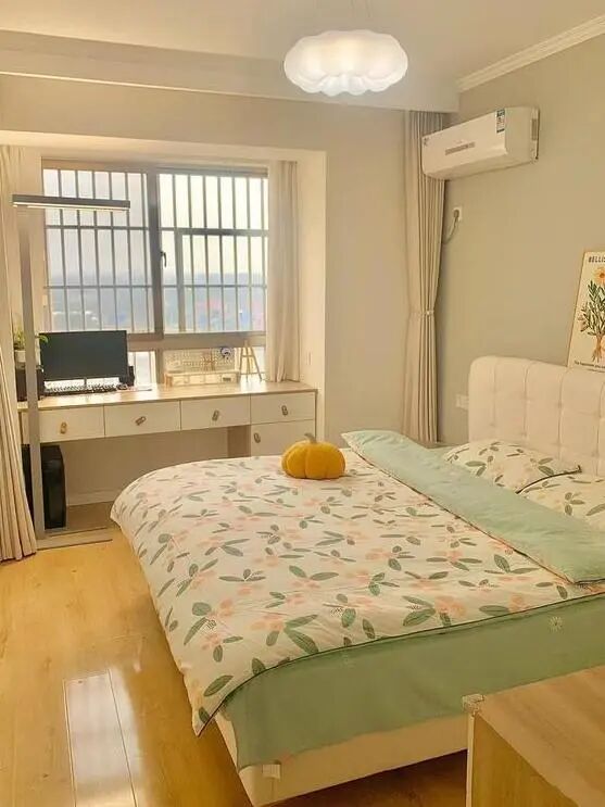 ,让空间更通透宽敞。床头背景墙刷了浅绿色的乳胶漆,搭配绿色花朵床品,营造出小清新的氛围。